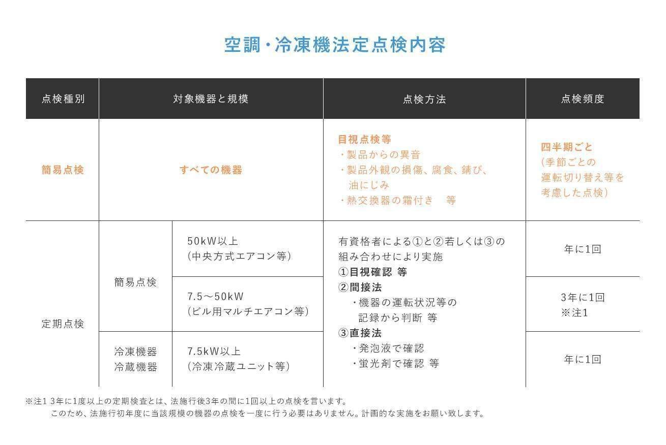 2015年4月、環境省により地球温暖化対策の一環としてフロン排出抑制法が定められ、空調設備、冷凍機等の法定点検は現在義務化されています。そのため一定容量以上の機器は有資格者による定期点検が必須です。まだ定期メンテナンス等の保守契約を結んでいないというお客様がおられましたら、お気軽にエアーカスタムまでお問い合わせください。 安心・安全・快適な環境を実現できるよう、わたしたちがとことんサポートさせていただきます。
